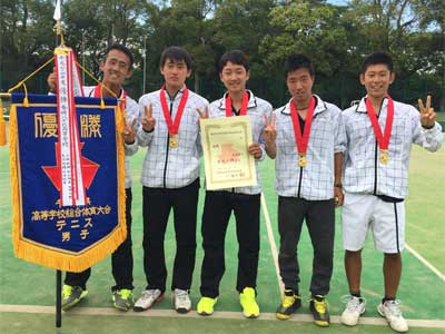 決勝戦の緊張感がより一層重く感じられる曇り空の中行われた男子決勝戦は、第1シード秀明八千代高校と第2シード東京学館浦安高校の対戦となった。秀明八千代高校の清水選手と、東京学館浦安高校の中山選手のシングルス2は、両者一歩も引かない激しいストローク合戦となった。試合序盤、清水選手はコートを広く使い、スピードのあるストロークで中山選手を走らせるが、中山選手は巧みなカウンターショットや滑るスライスで清水選手の攻撃を躱していく。77となった第15ゲーム、清水選手は更にギアを上げ、角度と深さの増したボールに苦しむ中山選手を引き離し、最後は強烈なフォアハンドでエースを取り秀明八千代高校の1-0リードとした。 ダブルスは、秀明八千代高校の白石・渡邉組と東京学館浦安高校の池田・河野組となった。池田・河野組は力強いサービスとストレートアタックで白石・渡邉組を抑え2-1とリードするが、白石選手の巧みなネットプレーがその流れを断ち切り、そこから一気に流れに乗った白石・渡邉組が73と巻き返す。池田・河野組が巻き返しを図ろうと必死に食らいつく隣では、シングルス1の秀明八千代高校の宮本選手と、東京学館浦安高校の蓮見選手の激戦が繰り広げられていた。互いに深さのあるストローク、相手の逆を突く巧みなネットプレーで一歩も退かない。宮本選手にリードを許すも、蓮見選手は必死に攻め続け、ポイントを取る毎に雄叫びをあげ、絶対に勝ちたいという強気の姿勢を崩さない。徐々に蓮見選手が逆転しはじめ、蓮見選手が76とリードして迎えたチェンジコートの間、ダブルスでは白石選手の渾身のスマッシュがマッチポイントを決め、秀明八千代高校の優勝が決定した。 |