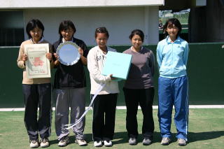 | 今大会第1シードの学館浦安高校と第2シードの渋谷幕張高校が順当に勝ち上がっての対戦となった。シングルスNo.1は、個人戦シングルスでも第1シードの学館浦安の有松選手が、同じく第2シードの渋谷幕張の林選手に対し、サウスポーからの伸びのあるサービスと、切れ味鋭く安定感のある ストロークで終始圧倒し、6−1で勝利した。同時に行われていたダブルスは、学館浦安が1年生の小林選手とダブルスを得意とする杉山選手を起用したのに対し、渋谷幕張は今大会の個人戦ダブルスで第2シードの加藤・湊組を起用し、必勝態勢で臨んだ。しかし、立ち上がりから学館浦安ペアが気迫のこもったリターンでペースをつかむと、やや受けにまわった加藤・湊組に付け入るスキを与えず、6−1で快勝し、2年連続3度目の優勝を手にした。決勝戦と同時に行われていた3位決定戦には、このところ私立校に上位を独占されていた中、君津青葉高校が第4シードの東海大浦安高校、第5シードの東邦高校を連破して臨んだが、第3シードの東京学館高校には健闘及ばず、関東大会の切符を手にすることはできなかった。 | 県No.1高雄選手を擁する第1シードの渋谷幕張高校と、新入生・池田選手の加入で層に厚みの増した第3シードの東京学館高校との対戦となった。3面同時展開で行われ、ダブルスとシングルスNo.1で渋谷幕張が序盤をリードし、流れをつかむ。やや精彩に欠ける東京学館の小松・秋田組に対し、実力で上回る渋谷幕張の高ア・ 清水組は徐々にリードを広げ、5−1で迎えたサウスポー清水選手のサービスゲームもラブゲームでものにし、6−1で先勝した。一方高雄選手は、東京学館の丹選手に対し5−0とリードし、そのままラブゲームで勝利するかと思われたが、わずかなミスに乗じた丹選手も2ゲームを取り返した。しかし、序盤の大量リードで優位に立つ高雄選手が粘る丹選手を振りきって6−2で勝利し、接戦を展開していたシングルスNo.2の南選手と池田選手の結果を待たずに、渋谷幕張が8年ぶりの優勝を果たした。 |