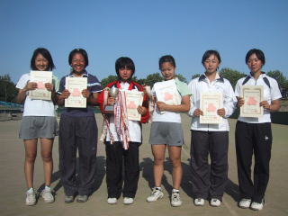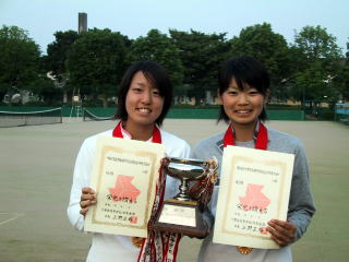| 順当に勝ち上がった大会第1シード南選手(渋谷幕張高)と第2シード奥間選手(学館浦安高)の対戦となった。決勝戦は南選手のサービスで始まった。今大会が高校での初めての試合となる奥間選手は、立ち上がり硬さが見られミスが目立つ。しかし南選手2−0リードの第3ゲームからその硬さも徐々にほぐれ、スピードのあるストロークでポイントを重ねて3−2と逆転に成功する。南選手も緩急をつけて反撃を試みるが、奥間選手は逆に切れのあるドロップショットで応戦し、差を広げてゆく。奥間選手5−2リードの第8ゲーム、南選手も粘りをみせるが、最後は勝負を賭けたフォアハンドがベースラインをわずかにオーバーし、この瞬間に奥間選手の初優勝が決まった。 | 昨年の新人戦に続き,2大会連続優勝を目指す第1シード 江戸・林ペアと第3シード 奥間・石川ペアの決勝となった。ダブルス巧者の江戸・林ペアはコンビネーションも良く,立ち上がりから快調にポイントを重ね,5−0までリードを広げる。一方,奥間・石川ペアも意地を見せ3ゲーム挽回する。流れが奥間・石川ペアに傾きかけていたが,ゲームポイントのかかったところで林選手のサービスエースがあり,息を吹き返した江戸・林ペアが6−3で後輩ペアを振り切り,大会初優勝を飾った。 |
