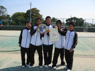 | 快晴の中行われた男子決勝、新人戦と同じ第1シード秀明八千代高校と、第2シード東京学館浦安高校の対戦となった。ダブルスは、東京学館浦安,畑山・白井組が3−4からの白井選手のサーブゲームをラブゲームでキープし、その後3ゲームを連取し6−4で先手を取る。シングルス1は秀明八千代・志賀選手が1−1後の第3ゲーム、東京学館浦安・蜂谷選手のサービスゲームを緩急を交えたショットでサービスブレークをすると一方的な展開となり6−1で志賀選手が蜂谷選手を圧倒、勝敗はシングルス2の結果次第となる。シングルス2は秀明八千代・竹内選手、東京学館浦安・中村選手の対戦。竹内選手の2−0で迎えた第3ゲーム、中村選手が竹内選手のサービスゲームを気迫でブレークし,その後のゲームもストローク戦をしっかり振り抜きポイントを重ね竹内選手を圧倒。6−3で勝利し、東京学館浦安高校に7年連続8度目の優勝をもたらし昨年新人戦の雪辱を果たした。 |