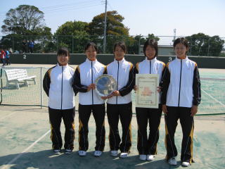 決勝まで1セットも落とさずに順調に勝ち進んできた第1シード秀明八千代高校と準決勝で第2シード東京学館高校を破った第3シード東京学館浦安高校との昨年と同じ対戦となった。ダブルスは秀明八千代,金子・後藤組がコンビネーションもよくポイントを重ね6−3で神谷・宮崎組を破った。シングルス1は個人戦第1シードの秀明八千代・美濃越選手と東京学館浦安・三上選手の間で行われた。2−2となった後の第5ゲームから美濃越選手の強力なストロークが三上選手を押し初め4−2とリードするがそこから三上選手が集中力を増し,美濃越選手にくらいついていき3ゲームを連取し6−4と逆転勝利を収め勝負はシングルス2にかかる。シングルス2は秀明八千代・藤岡選手と東京学館浦安・石井選手の間で行われた。強力なストロークの撃ち合いでシーソーゲームとなったが第9ゲームで石井選手のサービスゲームをブレークした藤岡選手が続く第10ゲームをそのままの勢いでキープし6−4で勝利,秀明八千代高校が2年連続2度目の優勝を決めた。 |