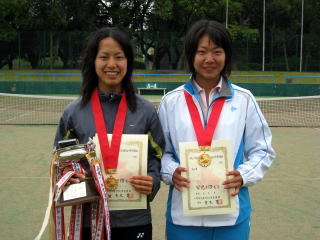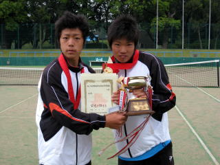 第1シードを破り勢いに乗る第8シード東京学館浦安高校畑山・中村組と順当に勝ち上がった第2シード同じく東京学館浦安高校蜂谷・松森組との対戦となった。序盤,蜂谷・松森組は固さが見られたが,蜂谷選手のボレー,松森選手のサービスが冴え,一時流れを引き寄せる。しかし,焦らずにじっくり攻め続ける畑山・中村組は,畑山選手のボレー,中村選手の鋭いストロークを武器にミスを誘い,着実にポイントを重ねる。最後は,蜂谷選手のサービスゲームをブレークし,6−4のスコアで勝利。畑山・中村組は,みごと初優勝を飾った。 |