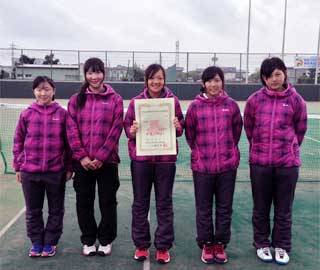 強風と時折大粒の雨が降る中行われた女子決勝は順当に勝ち上がった第1シードの秀明八千代高校と第6シードながら第2、第3シードを倒して勢いにのる東京学館浦安高校の対戦となった。試合はダブルス、シングルス1の2面展開で行われた。シングルス1は春の全国選抜大会の個人戦で優勝した秀明八千代の大河選手が学館浦安の富田選手を安定したストロークで圧倒し6-0で勝利した。ダブルスで勢いにのりたい学館浦安であったが、最初のサービスゲームを大川・小出ペアがキープしたものの続く5ゲームを秀明八千代の宮内・鈴木ペアがとり、一気にマッチゲームを迎えた。続くゲームは学館浦安ペアがサービスをキープし粘りをみせたが、地力に勝る秀明八千代ペアが最後のゲームを取り6-2で勝利し、この瞬間に秀明八千代高校の2年ぶり5回目の優勝が決まった。 |