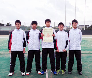 | 男子団体戦決勝は、昨年同様第1シード東京学館浦安高校と第2シード秀明八千代高校の対戦となった。両校共初戦より気合の入った対戦で決勝まで進んできた。 ダブルスは東京学館浦安 斉藤選手・上島選手の3年生ペアに対し秀明八千代は奈良部選手・宮本選手の2年生・1年生のペア、2-1と両校サービスキープで迎えた第4ゲーム秀明ペアが鋭いリターンを決めサービスブレーク、そこから勢いに乗り5-1とリード、斉藤選手・上島選手のペアも第7ゲーム第8ゲームを積極的な攻めで5-3と追いすがるものの奈良部選手・宮本選手のペアがサービスゲームをしっかり決めきり6-3で先手を取った。シングルス1は選抜個人優勝、第1シードの小林紀輝選手と第2シードの高村選手の対戦となった。出だし3ゲーム積極的な攻撃を仕掛ける高村選手が丁寧にコースを打ち分ける小林選手を圧倒3-0とリード、小林選手も持ち前のストロークでつなぐも高村選手がバックハンド、スピン、スライスを打ち分けチャンスをつかみネットでポイント重ね4-2、その後も積極的な攻撃をゆるめず連取6-2で小林選手に勝利し対戦を1-1としたシングルス2は東京学館浦安、小林雅哉選手、2年生と秀明八千代、渡邉選手、1年生の対戦となった。両選手サービスキープでむかえた第4ゲーム、小林選手が渡邉選手の甘いボールを見逃さずしっかり打ち込みブレーク、一気に4-1とリード、第6ゲーム途中より雨が強く降るも学浦、小林選手が集中を切らせることなくゲームを重ね6-1で秀明、渡邉選手を退け2-1で東京学館浦安高校が2連覇を達成した。 |