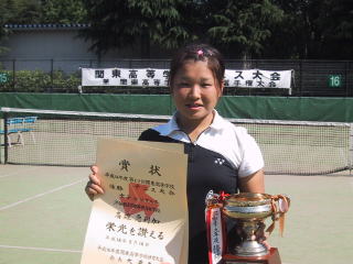 | 男女シングルス 46,76,63と逆転勝利,全国選抜個人戦に続く関東優勝!インターハイでの活躍に弾みをつけた。 準々決勝で共栄学園の前澤選手に0−5と絶体絶命のピンチをタイブレークの末勝利し準決勝では共栄学園の木川選手にストレート勝ちの末の優勝であった。 |