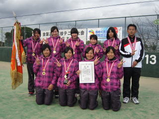 女子団体戦は,第1シード秀明八千代と第2シード早稲田実業との対戦であった。決勝まで1ポイント落としただけの秀明八千代がS1を取ったもののD1,S2を落とし苦しい展開。D2はストレートで勝利し,S3勝負へ。ゲームは序盤から早実のリードで進んだが,岩井選手が粘ってタイブレークへ持ち込む。すると,勢いをそのままに7-2でタイブレークを制し,2年振り2回目の勝利を勝ち取った。 |