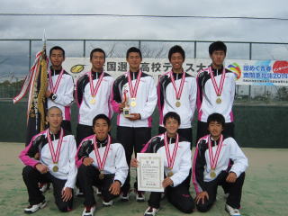 | 第1,第2シードが2回戦で敗退する波乱の男子団体戦,決勝に駒を進めたのは第4シードの東海大菅生とノーシードから激戦ブロックを勝ち抜いた足利工大附。S1とD1を先勝した東海大菅生,D2を落としたが,S2が6-3で勝利し対戦の勝敗を決めた。1回戦から安定した力を発揮した東海大菅生は4-1で7年振り3回目の優勝であった。 男子団体はいずれの対戦も拮抗した勝負で,見所満載であった。 |