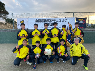 | 冬晴れの空の下、第1シード湘南工大附と第3シード足利大附が4面展開で決勝は始まった。湘南工大附のシングルス1石井選手が緩急をつけたストロークから果敢にネットプレーをして勢いそのままに61で勝ち、まず1勝。 シングルス2坂本選手も激しいストロークの中でリズムを作り湘南工大附がそのままの流れで62と勝利し、優勝に大手をかけた。 ダブルス1は湘南工大附の笹本、関口組が多彩なフォーメーションから積極的にポーチに出るもののスコア44まで接戦であったが、最後は足利大附が粘ってポイントを確実に取り64で勝利し対戦成績を1-2にする。 ダブルス2はお互い序盤からミスもあり波に乗れず均衡したまま終盤となったが、足利大附の中山・金田組がリードし65となる。湘南工大附はツーバックで最後まで粘りを見せたが足利大附が75で勝利し、対戦成績を2-2と戻した。 優勝争いはシングルス3に託された。ゲームの序盤、足利大附の海野選手が3ゲーム先取するも、湘南工大附の村上選手が緩急をつけたストロークを武器に23と粘りを見せた。しかし、最後は相手のミスを誘い出すようなサイドに打ち分けたストロークを駆使した足利大附が64で大接戦を制し、19年ぶり3度目の優勝を決めた。(文責:小堀) |