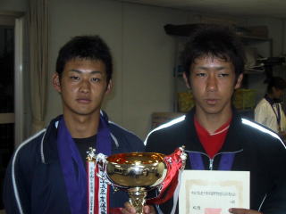 | 直前に降りだした小雨の中行われた決勝は、危なげなく勝ち上がった第1シード学館浦安高校の風早・小林ペアと準々決勝、準決勝で苦しい試合を競り抜いてきた第6シード八千代松陰高校の建部・石川ペアの顔合わせとなった。風早のサービスで始まった第1ゲームは安定さを欠いた学館浦安ペアのミスが目立ち八千代松陰ペアが先取した。第2ゲームでは建部のサービスが冴え2−0とリードを広げた。このまま八千代松陰ペアに流れが傾くかと思われた第3ゲームをボールコントロールに苦しみながらも学館浦安ペアがキープすると、続く第4ゲームも連取し流れをを引き戻した。第5ゲームは、お互い一歩も譲らぬ展開となったが、苦しみながらも学浦ペアがキープすると、風早、小林ともに本来のショットの切れが戻り、以降ゲームを落とすことなく、6−2のスコアで2年連続2度目の優勝を勝ち取ると同時に、学館浦安高校 小林選手は嬉しい三冠を達成した。 | 大会第1シード学館浦安高校の奥間・石川ペアが、怪我により途中棄権というアクシデントのあった女子ダブルスの決勝は第2シード東京学館高校の池田・美濃越ペアと第4シード八千代高校の岩崎・野村ペアの対戦となった。序盤、池田のネットプレーでポイントを重ねる東京学館に対し、八千代は決勝戦の硬さからネットプレーにミスが多く、東京学館が3−0とリードする。硬さのとれた八千代も本来の力を発揮し、3−3まで追いつくものの、続く第7ゲームは長いデュースの末、東京学館がとり、4−3と再びリードする。地力に勝る東京学館高校池田・美濃越ペアが、最後は、6−4で八千代高校岩崎・野村ペアを振り切り、初優勝を飾った。 | ||