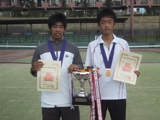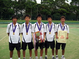 第1シード東京学館高校の美濃越・鈴木組と第3シード東京学館浦安高校の猪俣・後藤組の対戦となった決勝戦。美濃越選手のサーブで始まるが,ダブル・フォールトを2度犯し,デュースを繰り返した後,ブレイクされる。その後序盤は互いにサービスをキープできず,後藤選手がようやくサービスゲームをキープし4−2とリードを広げる。東京学館ペアも鈴木がサービスをキープし粘りを見せるが東京学館浦安5−3リードの第9ゲームで,この試合調子に乗れない美濃越選手のストロークがバックアウトとなり,猪俣・後藤ペアが初優勝を飾るとともに,東京学館浦安高校は男女完全制覇を達成した。 |