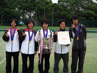 | 順当に決勝へ駒を進めた第1シードの東京学館浦安高校と,準決勝の接戦を逆転でものにして勝ち上がった第2シードの東京学館高校の顔合わせとなった。3面同時展開で行われ,第2シングルスの東京学館浦安・八角選手は深く角度のあるフォアハンドストロークで東京学館の五十嵐選手を圧倒し,6-0のスコアで先勝した。ダブルスでは,東京学館浦安の越智・増尾組が切れの良いボレーとコンビネーションの良さで東京学館の渡辺・若杉組に付け入る隙を与えず,6-2のスコアで勝利し,第1シングルスの星野選手と岩田選手の結果を待たず4年連続5度目の優勝を手中にした。 | 女子団体戦決勝は順当に勝ち進んだ第1シード東京学館浦安高校と第2シードの東京学館高校に対戦となった。3面同時展開で行われ第2シングルスは東京学館浦安・猪俣選手が東京学館・小松選手をストロークで寄せ付けず6−0と一蹴し一勝をもたらした。また,その隣では奥間選手が強烈なフォアハンドを軸に,時折ドロップショットを織り混ぜ,強打の美濃越選手を翻弄して6−1と勝利を収め,ダブルスの結果を待たず東京学館浦安高校が3年連続5回目の優勝を飾った。 <記録担当> |