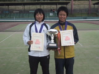 順当に勝ち上がった第1シードの東京学館浦安,星野・増尾組とガッツあふれるプレーで接戦を勝ち上がってきた東京学館,岩田・五十嵐組の決勝となった。星野・増尾組は立ち上がりこそ硬さがあり,ダブル・フォールトなどのミスが多くサービスブレークをされたが,中盤以降は安定してきたサービスに加え,強烈なリターンや力強いストロークで粘る岩田・五十嵐組を圧倒し,星野・増尾組が6−2で勝利し,優勝を飾った。星野選手は1年生ながら,団体・シングルスと合わせて3冠となった。 |
