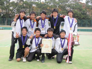| 男子決勝は、8度目の優勝を目指す第1シード学館浦安高等学校と、2度目の優勝を目指す第2シード秀明八千代高校の、昨年度と同カードとなった。 対戦は4面同時展開で行われた。シングルス2学館浦安高校高野選手と秀明八千代高校山外選手の対戦は激しいストローク戦となる。山外選手は高野選手のバックハンドをついてチャンスを作り、4−1リードとする。その後、高野選手も4−3まで挽回するが、最後はサービス力に勝る山外選手が6−4のスコアで勝利した。ダブルス2学館浦安高校石井・横川ペアと秀明八千代高校梅澤・小谷地ペアの対戦。デュースが続く長いゲームが続く。そのゲームを常に取った石井・横川ペアが6−3のスコアで勝利した。ダブルス1学館浦安高校大塚・長谷川の1年生ペアと秀明八千代高校真下・宗田の2年生ペアの対戦。大塚・長谷川ペアが第2ゲームをブレークすると真下・宗田ペアもすぐにブレークバックし、試合は混沌とする。ボールを足元に沈め、チャンスボールを確実にポイントした大塚・長谷川ペアが6−4で逃げ切り、ポイントは2−1となる。シングルス1学館浦安高校由井選手と秀明八千代高校吉田選手の対戦は激しい打ち合いとなる。随所でカウンターショットを放ち、ボレーでポイントを重ねる由井選手に対し吉田選手は力強いサービスとフォア・バック鋭く振り抜くストロークで応戦する。最後は由井選手が4ゲームを連取し、6−4のスコアで勝利し、学館浦安高校が2年連続8度目の優勝を果たした。 |