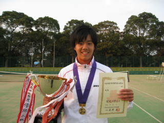 | 男子シングルスの決勝戦は、第3シードの昭和秀英高校中野選手と、第4シードの学館浦安高校大和田選手の対戦となった。序盤、共にサービスキープの展開となる。1−1で迎えた第3ゲーム大和田選手の甘くなったサーブを力強いリターンで中野選手がブレークに成功する。しかし、その後中野選手のミスが目立ち始め、第7ゲームはお互い譲らずポイントを取り合う長いゲームになったが、丁寧にボールコントロールした大和田選手がリードする。大和田選手は、強烈なフォアハンドを要所で使い、効果的なアングルショットも冴え、後半は主導権を握り、そのまま6−3のスコアで嬉しい初優勝を飾った。 |