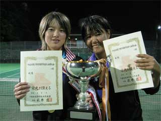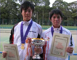 | 男子ダブルス決勝は、第1シードの児玉・安藤組(八千代松陰)と第3シードの大和田・松本組(東京学館浦安)の対戦となった。立ち上がりの第1ゲームは安藤選手のサービスゲームであった。40-0から大和田・松本組が強いリターンでデュースに持ち込んだ。このプレッシャーがダブルフォルトを呼び込み、ブレイクでスタートした。続く第2ゲームを大和田選手がキープして波に乗り、序盤は3−0と大和田・松本組のペースで進んだが、第4ゲームで松本選手のサービスゲームをブレイクすると、児玉・安藤組は本来の多彩なコンビネーションを取戻した。一方、大和田・松本組も強烈なストロークと早い動きのネットプレーで応戦し、一進一退の展開となった。終盤、5−5となったところで児玉選手のサービスゲームをブレイクした大和田・松本組は最後まで攻撃的なプレイを続け、そのまま7−5で振り切った大和田・松本組が初優勝を決めた。 | 女子ダブルス決勝は第1シードの学館船橋並木・根本ペアと第2シードの学館浦安羽澤・小島ペアの対戦となった。入りの2ゲームはお互いにサービスをキープしたが第3ゲームで羽澤選手の強気のストレートアタックが効き根本選手のサービスブレークに成功する。続く第4ゲーム根本選手のポーチ・ストレートアタックが決まり並木・根本がゲームを奪い返す。続く第5、6ゲームはお互いの持ち味を出しサービスキープ合戦をなるが、第7ゲームで再び根本選手のサービスブレークを許し、羽澤・小島ペアから4−3アップとなる。第8ゲームは小島選手のダブルフォルトが響き、並木・根本ペアがブレークバックした。並木・根本ペアは続く2ゲームをしっかりとものにし、6−4で優勝した。並木・根本ペアはうれしい2連覇となる。 | ||