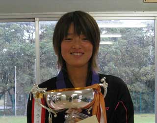 女子シングルス決勝は、決勝まで2ゲームしか失わずに勝ち上がった第1シードの並木選手(東京学館船橋)と、徐々に調子を上げてきた第7シードの山添選手(渋谷幕張)の試合となった。静かな立ち上がりで両者1ゲームずつキープした後の第3ゲームで山添選手はダブルフォルトが響いてブレイクされる。続く第4ゲームは長いデュースの後、並木選手のサービスが要所で決まり、3−1と並木選手がリードした。その後は並木選手のフォアハンドの強打が炸裂し、山添選手を引き離し、6−2で並木選手の嬉しい初優勝が決まった。 |