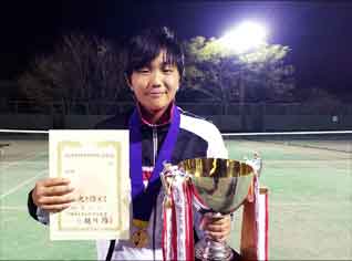 女子ダブルス決勝は、日没のためKTテニスクラブに移動し、ナイターを使っての戦いとなった。日没後は気温も下がり寒いくらいであったが、選手たちの心は優勝を勝ち取るため燃え滾っているように思われた。女子の決勝戦は、シングルスに続きダブルス優勝を狙う都筑・矢田組(学館浦安)、北村・渡邉組(学館船橋)の対戦となった。序盤、北村・渡邉組が硬さのあった都筑・矢田組から20とリードするが、流れを変えようと矢田の力強いフォアハンドストロークと都筑のポーチボレーで22とタイに持ち込んだ。ここから硬さのとれた都筑・矢田組が一気に3ゲーム連取し、52とリードする。巻き返しをはかる北村・渡邉組は1ポイントずつポイントを重ね54まで追いつくが、矢田の力強いサーブと都筑のポーチボレーでマッチポイントを握る。最後は矢田のSAで優勝をもぎ取った。今大会、矢田選手は、団体戦、シングルス、ダブルスと3冠となった。 |