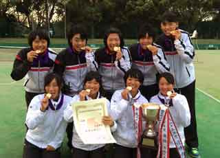 昨日とはうってかわり小春日和となった迎えた女子シングルス決勝は、オールラウンドなテニスで勝ち上がった第1シード学館浦安高校矢田選手と、持ち前の強打で決勝まで駒を進めた第3シード学館浦安高校高西選手の対戦となった。お互い1キープ・1ブレークの2オールで迎えた第5ゲーム、高西は40−0からデュースに追いつかれる悪い流れになるが、その後の2ポイントをファーストからの強打でピンチをしのぐ。続く第6ゲームは高西の高い打点からの強打を低いスライスで防いだ矢田がサービスをキープして3オールとなる。そしてお互いサービスをキープした第9ゲームで試合が動いた。ファーストの入りが悪くなった高西に対し、矢田は得意のネットプレーで相手にプレッシャーを与え4回目のブレークポイントをものにした矢田から5−4アップとなる。続く10ゲームはサーブ&ボレーやアプローチ&ボレーを入れた矢田がサービスをキープしてうれしい初優勝をとげた。 |