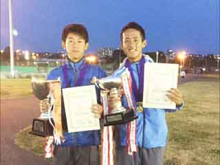 男子ダブルス決勝は、照明がともる4時にスタートした。決勝に進んだのは、お互いに3ゲーム以上取られることなく順当に勝ち進んだ第1シードの渡邉・宮本組(秀明八千代)と第2シードの池田・河野(学館浦安)であった。立ち上がりから積極的にネットを取る池田・河野組に対し、渡邉・宮本組は強烈なストロークで対抗した。アタックと角度のついたショット、ロビングとプレッシャーをかける渡邉・宮本に池田・河野は思うようなプレイをさせてもらえない。渡邉・宮本の40で迎えた第5ゲーム。宮本選手のサービスゲームで15-40とブレイクのチャンスがあったが、ここでも渡邉・宮本が相手の動きを見た落ち着いたボール回しを見せて凌ぐとそのまま一気に60と勝利し、渡邉・宮本組の初優勝が決まった。なお、宮本選手は今大会、団体、シングルスに続き3冠の偉業を達成した。 |
