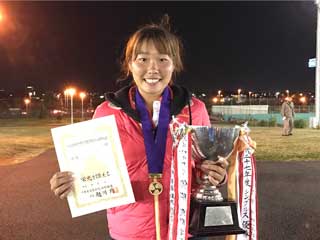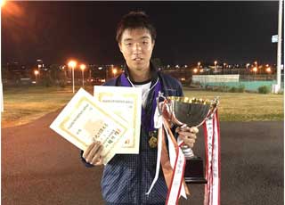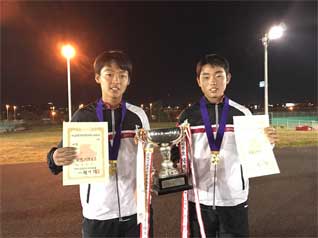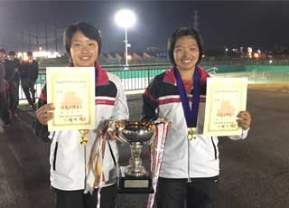 たっぷりと日の暮れた17:20、芝田選手のサーブで決勝戦は始まった。安定したサーブを放つ芝田選手がサービスゲームを簡単にキープ。2ndゲームは早川選手のサーブ。清水・芝田組は果敢にネットに詰めるが、ボールを上に、アングルに、上手くコントロールした早川・中山組がラブゲームでキープして1−1となる。3ゲーム目にゲームが動いた。3度のデュースの後、鋭いリターンを早川・中山選手の二人が続けざまに放ち、2−1とリードした。しかし続く第4ゲーム、中山選手のサーブを芝田選手が積極的にネットを取りボレーを決め、2オールに戻す。芝田選手のサービスゲームは要所で清水選手がポーチに出てポイントを重ね、3−2とリードする。第6ゲーム、2度のデュースの後の長いラリーの末清水選手のショットが決まり4−2とリード。次の第7ゲームも清水選手がサービスをキープし5−2。第8ゲームは4度のデュースのあと清水選手、芝田選手のボレーが次々と決まりシーソーゲームであったが、6−2と貫禄の勝利であった。敗れた早川・中山組であるが、ノーシードから決勝まで勝ち上がり今大会の台風の目となった。今後の活躍に期待したい。 |