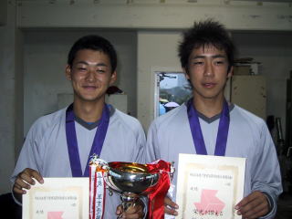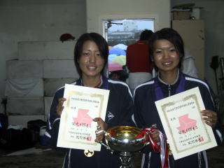 | 危なげない試合運びで、順当に決勝へ駒を進めた第1シードの風早・小林組と、準々決勝、準決勝と接戦をものにして勝ち上がった第6シードの長崎・荒木組との学館浦安高校の同校対決となった。立ち上がり、風早のサービスゲームをラブゲームでものにしゲームの主導権を握ると、時折イージーミスはあるものの要所を締める余裕のプレーで、結局6−3のスコアで初優勝を飾った。 | 順当に駒を進めた第1シードの東京学館高の中岡・秋田組と準決勝で粘る八千代高ペアを6−4で下した第3シード学館浦安高の林・江戸組の対戦となった女子ダブルスの決勝戦は、小雨の降る中行われた。ファーストゲームを接戦の末先取した林・江戸組は勢いづき、その後も着実にポイントを重ね5−0とリードを広げ迎えた第6ゲームもラブゲームでブレイクし、初優勝を飾った。 |