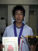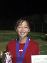 | 前日4−5でサスペンデットとなり、翌日白子に会場を移して行われた試合で、チームメイトの本田選手に逆転勝利を収めた大会第2シードの風早選手と、準々決勝で敗れた小林選手の雪辱を果たし駒を進めた第5シードの越智選手という学館浦安同志の対戦となった決勝戦。序盤は互いにサービスブレイクを許すが第3ゲームでサービスキープに成功した風早選手が徐々に攻撃のリズムに乗り始め、ゲームを重ねていく。越智選手もバックハンドのパスなどでポイントを取るものの、先に攻め込んでくる風早選手に対し、後手に回りゲームを奪えない。最後は風早選手のフォアハンドリターンがエースとなり、スコア6−1で初優勝を飾った。同時に行われた3位決定戦は、前日第1シードを破り波に乗る八千代松陰建部選手が思いきりの良いストロークで学館浦安本田選手を6−3で下した。 | 女子決勝戦はこの夏インターハイに出場した第1シード畑中選手(日大習志野)と第3シード池田選手(東京学館)の戦いとなった。安定したストロークを放つ畑中選手に対し攻撃する池田選手のサービスキープで始まった試合だが,第3,4ゲームはお互いにサービスブレークで2−2。続く第5,6ゲームを池田選手が,第7,8ゲームを畑中選手がゲームを奪い4−4。一進一退の手に汗握るポイント・ゲームが続くが,攻撃の手をゆるめない池田選手がタイブレークでは2ポイントを落としただけで7−6で勝利,うれしい初優勝を決めた。 |